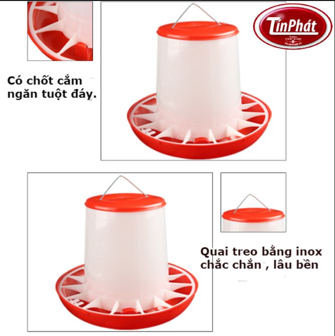 -Phần chứa thức ăn: Dạng chóp cụt, có nắp đậy kín đáo cùng quai treo thuận tiện giúp dễ dàng đặt vào các móc treo tránh trong chuồng. Vì có nắp đậy nên thức ăn bên trong không bị ẩm mốc, đảm bảo chất dinh dưỡng tốt.