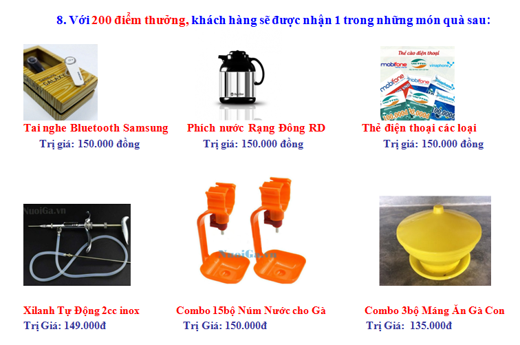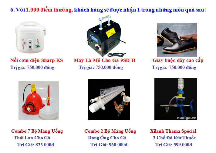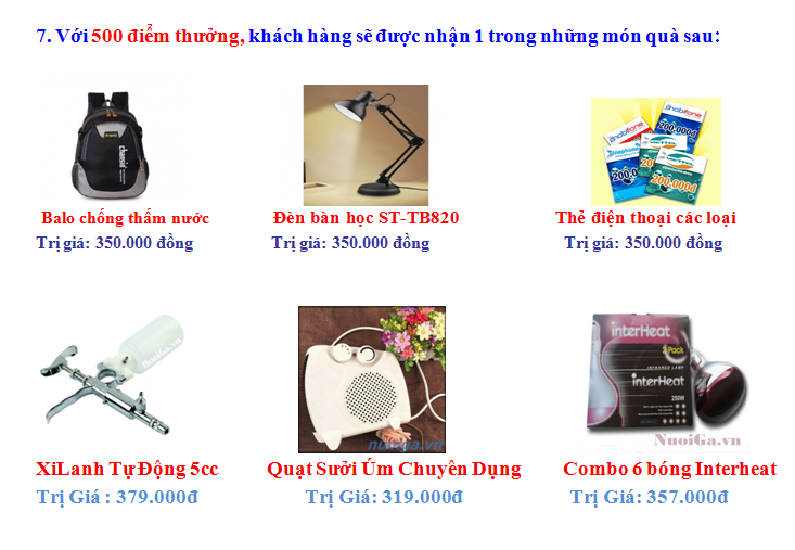♦ Với điểm thưởng, Quý Khách có quyền quy đổi theo danh sách quà tặng hấp dẫn, đa dạng (Bạn có thể xem chi tiết quà tặng trên web: nuoiga.vn hoặc gọi điện trực tiếp đến nhân viên chăm sóc khách hàng: 01233.110.033).