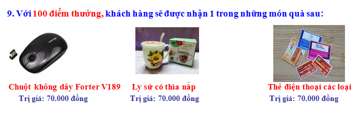• Quý Khách có thể đổi quà bất kỳ lúc nào bạn muốn, chỉ cần số điểm thưởng của bạn tương ứng với số điểm của Quà tặng.